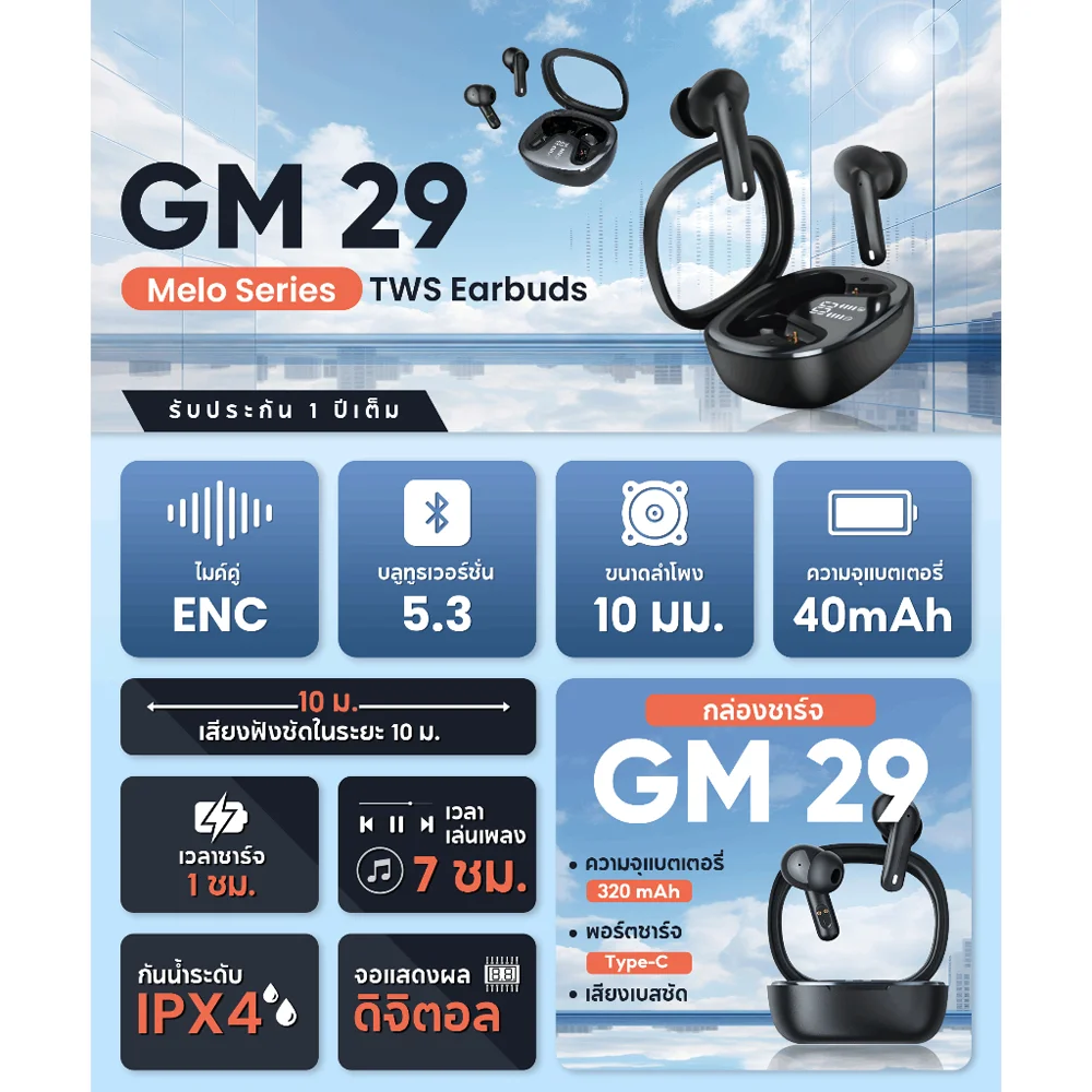 သံစဉ်တွေကို အပြည့်အဝခံစားနိုင်ဖို့ Gadget Max GM-29 Wireless Earbuds ရှိမှဖြစ်မယ်နော်။Bluetooth Versio 5.3 နဲ့မို့ ချိတ်ဆက်ရာမှာ မြန်ဆန်စေပါတဲ့အပြင် နားနဲ့ကွက်တိ ဒီဇိုင်းလေးမို့ တပ်ထားတဲ့အခါမှာလည်း သက်တောင့်သက်သာ ရှိစေပါတယ်။Type C Port လေးနဲ့အားသွင်းလို့ရပြီး Battery ကလည်း Earbuds Battery (40mAh) ၊ Case Battery (320mAh) ပါဝင်တာမို့ တစ်ခါအားသွင်းထားရုံနဲ့ (4/5) နာရီလောက်စိတ်ကြိုက်နားဆင်နိုင်ပါတယ်။
