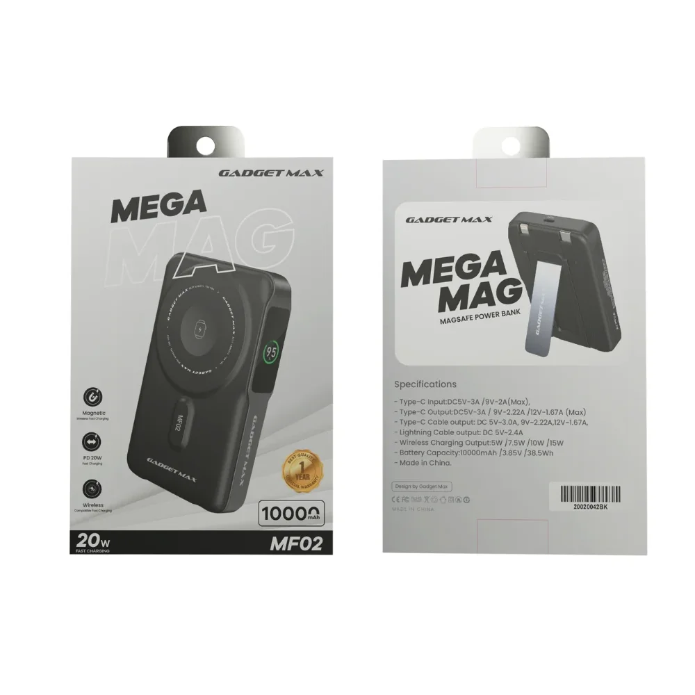 Gadget Max MF02 10000mAh 6In1 Magsafe Power Bank လေးမှာတော့ ဆွဲအားကောင်းတဲ့ သံလိုက်နဲ့ Magsafe wireless charging ကို ကိုက်ညီမှုရှိတဲ့ ဖုန်းတွေ အတွက် 15W အထိကို Supportပေးထားပါတယ်။ သူ့ရဲ့ 6-in-1 function ကလဲ ဘယ်စက်ကို အားသွင်းသွင်း အဆင်ပြေအောင်လို့ လုပ်ပေးထားပါတယ်။ အမြင့်ဆုံး 18W အထိ Support ပေးတဲ့ Type-C Output Cableကြိုး, 10W အထိ Support ပေးတဲ့ Lightning Output Cableကြိုး နဲ့ smartwatcheတွေနဲ့ and earbud တွေကိုအားသွင်းဖို့လဲ 2.5W output ပါပါသေးတယ်။ Output အတွက် (20W Max) Type-C Port နဲ့ Input အတွက် (19W Max) Type-C Port လဲပါလို့ သုံးရတာအဆင်ပြေမဲ့ Power Bank တစ်ခုပါဘဲ။