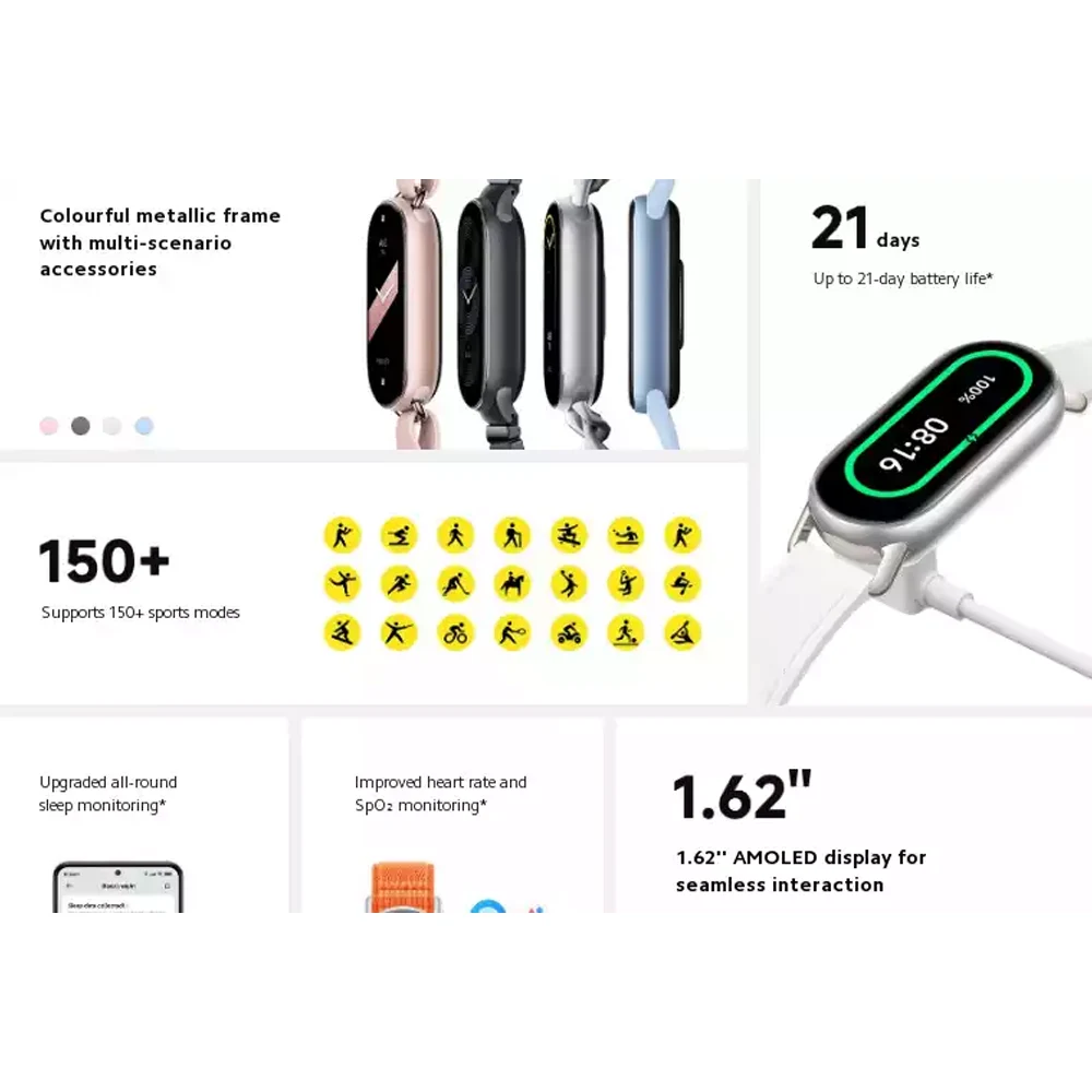Sport Type ဆန်ဆန် ကျစ်ကျစ်လျစ်လျစ် ပေါ့ပေါးပါးပါးလေးနဲ့ အထာကျတဲ့ Mi Band 9 လေးမှာ 1.62-inch မျက်နှာပြင်နဲ့ AMOLED Touch Display လေးကို အသုံးပြုထားပါတယ်။ 1နာရီခွဲ ဝန်းကျင်အားသွင်းရုံနဲ့ Typical Usage Time ကလည်း 20 ရက်ဝန်းကျင်ထိ သုံးလို့ရမှာဆိုတော့ အားခနခနမသွင်းချင်တဲ့သူတွေ အတွက်လည်း အဆင်ပြေစေမှာပါ။Mi Fitness လေးနဲ့ ချိတ်ဆက်ပြီး သူ့မှာပါတဲ့ Health Monitoring Sensor တွေနဲ့ Fitness Function တွေအသုံးပြုနိုင်မှာမို့လို့ ကျန်းမာရေးနဲ့ပါတ်သတ်တဲ့ Detail Info တွေကိုလည်း အလွယ်တကူစစ်ကြည့်နိုင်မယ့်အပြင် အားကစားလုပ်တတ်သူတွေအတွက်လည်း အဆင်ပြေစေမယ့် Smart Band လေးပါပဲ။